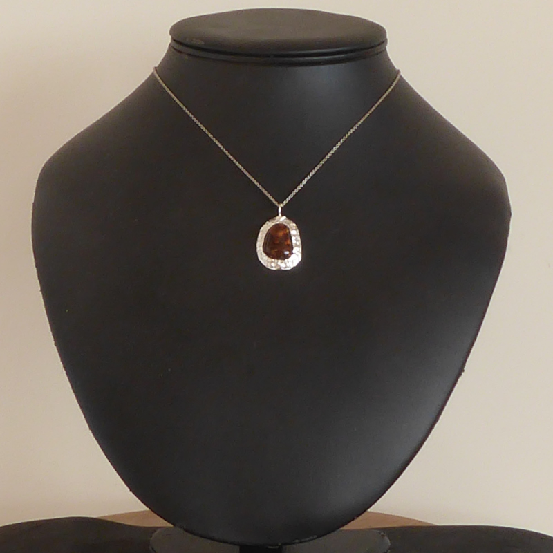 Unisex halsvedhæng. Stenen måler ca. 22 * 22 cm og er monteret i et Argentiumsterlingsølvrør, der er ophængt i en flettet lædersnøre, som er låst med en stållås.